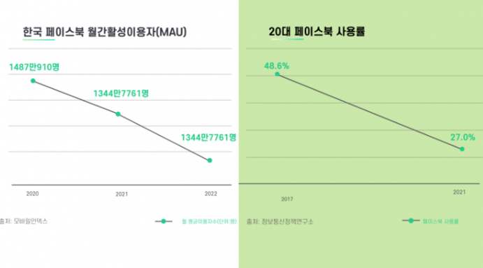 사용자수가 뚜렷하게 감소하고 있는 추세 속에서 정보통신정책연구소 발표를 보니, 세대별 이용현황 중 20대의 페이스북 사용률은 지난 2017년 48.6%였지만, 4년뒤인 2021년 조사에서는 27% 가량 감소했습니다.