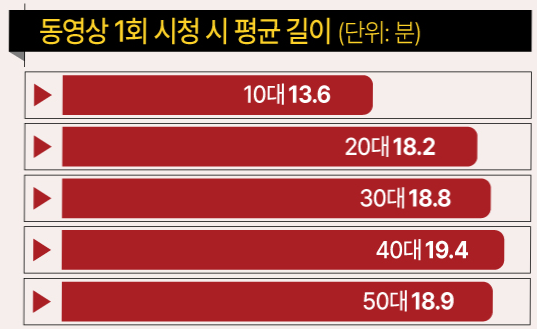 20대는 18.2분, 30대는 18.8분, 30대는 19.4분, 50대는 18.9분으로 나왔는데요. 이를 통해 젊은 세대들이 평균적으로 동영상 시청 시간이 짧은 것을 선호한다는 것을 알 수 있었습니다.