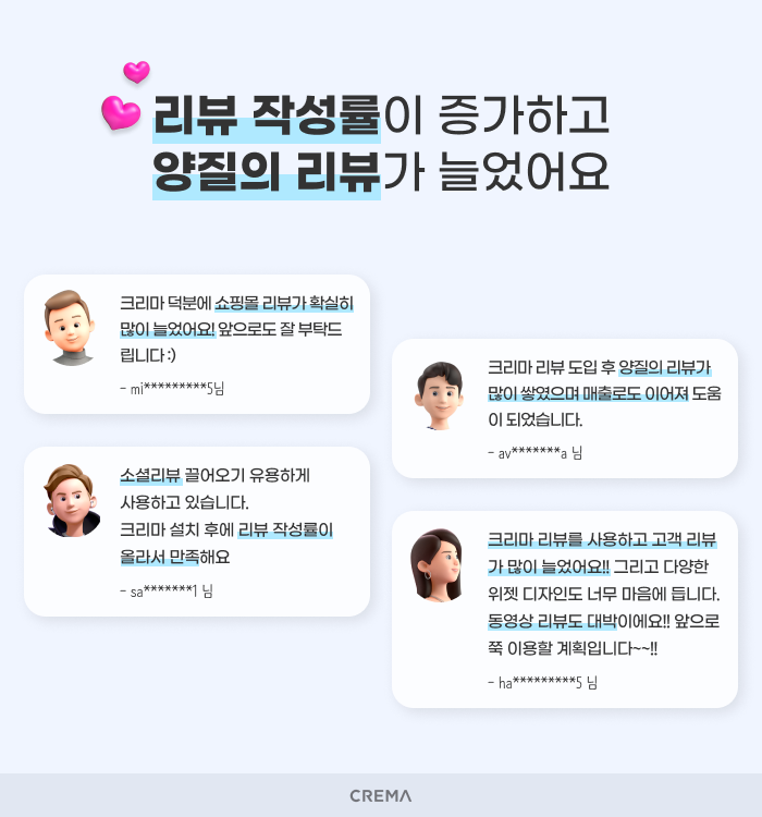 갑자기 궁금해졌어요. 이처럼 다양한 고객사의 자사몰 리뷰 환경을 조성하는 크리마 리뷰 서비스에 대한 평가는 어떨까요? 실제로 크리마 리뷰를 도입한 고객사의 리뷰를 살펴보고, 유형 별로 정리해봤습니다.