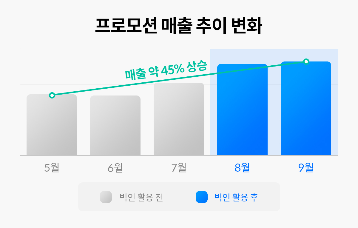 CRM과 퍼포먼스 마케팅으로 풀퍼널 마케팅을 진행한 D사는 빅인을 도입하기 전 진행했던 프로모션 성과 대비 매출이 약 45% 상승하는 경험을 할 수 있었습니다. 지금까지 다양한 프로모션을 진행했지만 빅인 활용 후 눈에 띄는 매출 상승을 달성한 것입니다.