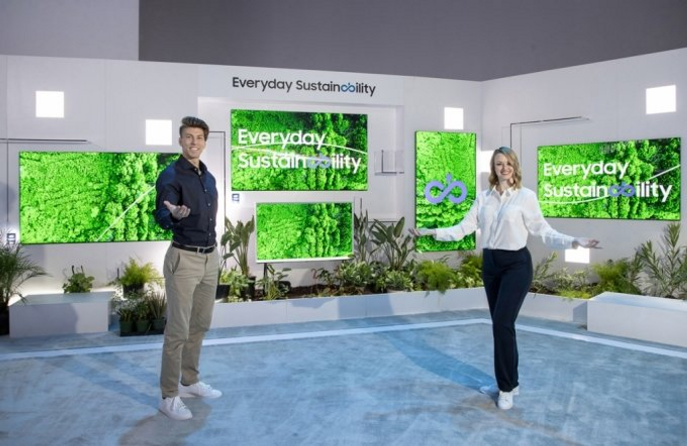 삼성전자는 올해 처음으로 전시관 내 ‘지속가능존’을 마련했어요. ‘지속 가능한 일상(Everyday Sustainability)’을 주제로 해양 폐기물 재활용 소재를 사용한 태양광 리모컨과 친환경 포장, 친환경 공법 등을 소개하죠.
