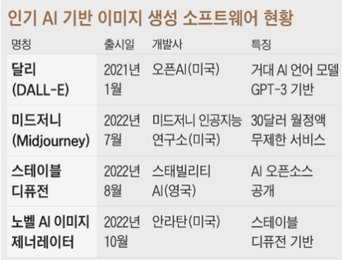 엔비디아의 고갱 외에도 시중에 여러 AI화가 소프트웨어가 이미 치열한 경쟁을 하고 있습니다. 그 중 유튜브 등에서 많이 인용되는 소프트웨어들은 달리(DALL.E), 스테이블디퓨전(Stable diffusion), 미드저니(Midjourney) 를 들 수 있습니다.